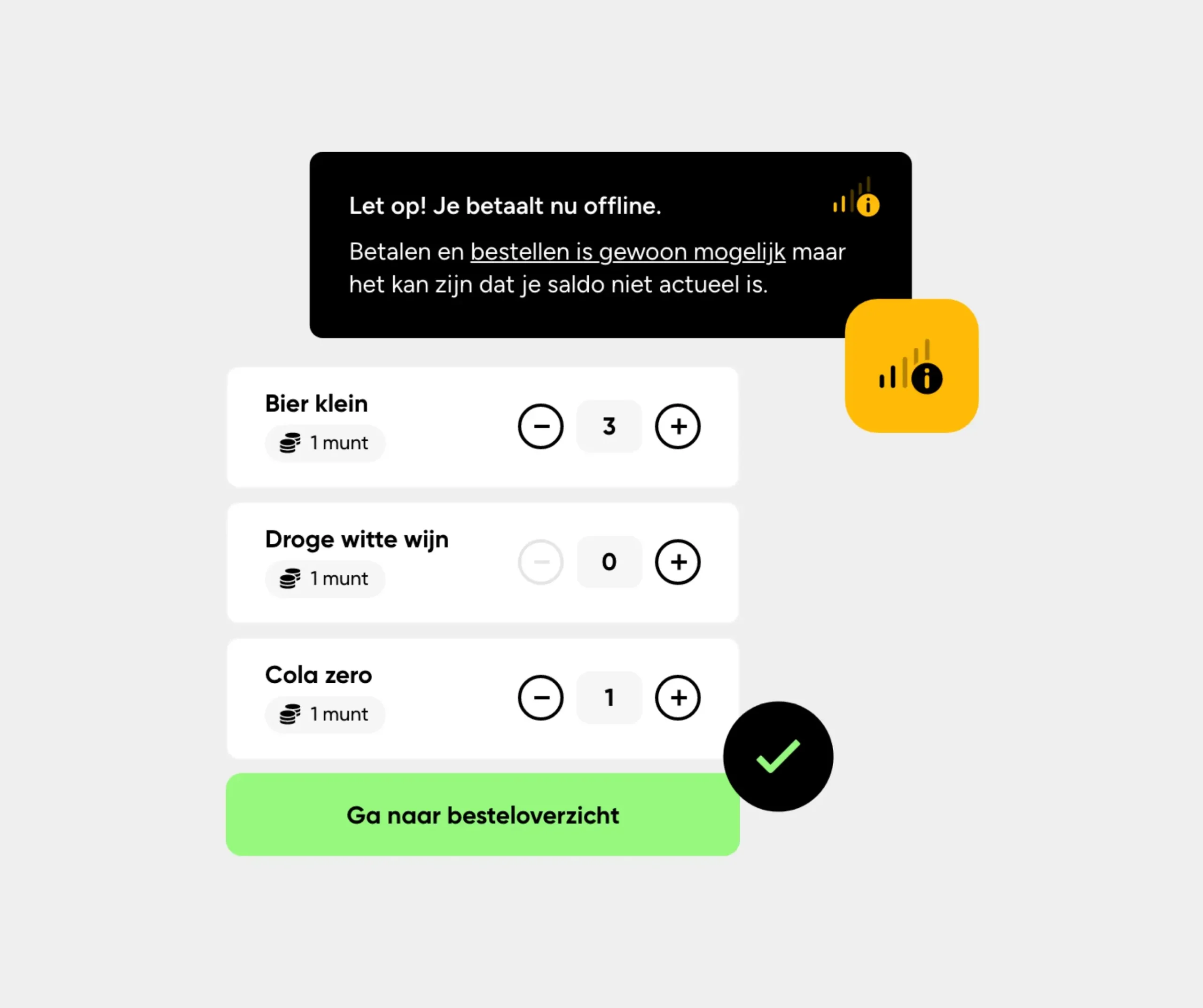 De bezoeker kan de app offline gebruiken om te bestellen. De kassa’s hebben internet nodig, wat wij voor je uit handen nemen. Als back-up maken wij gebruik van datakaarten die automatisch switchen tussen drie dataproviders en daar de beste van selecteert.